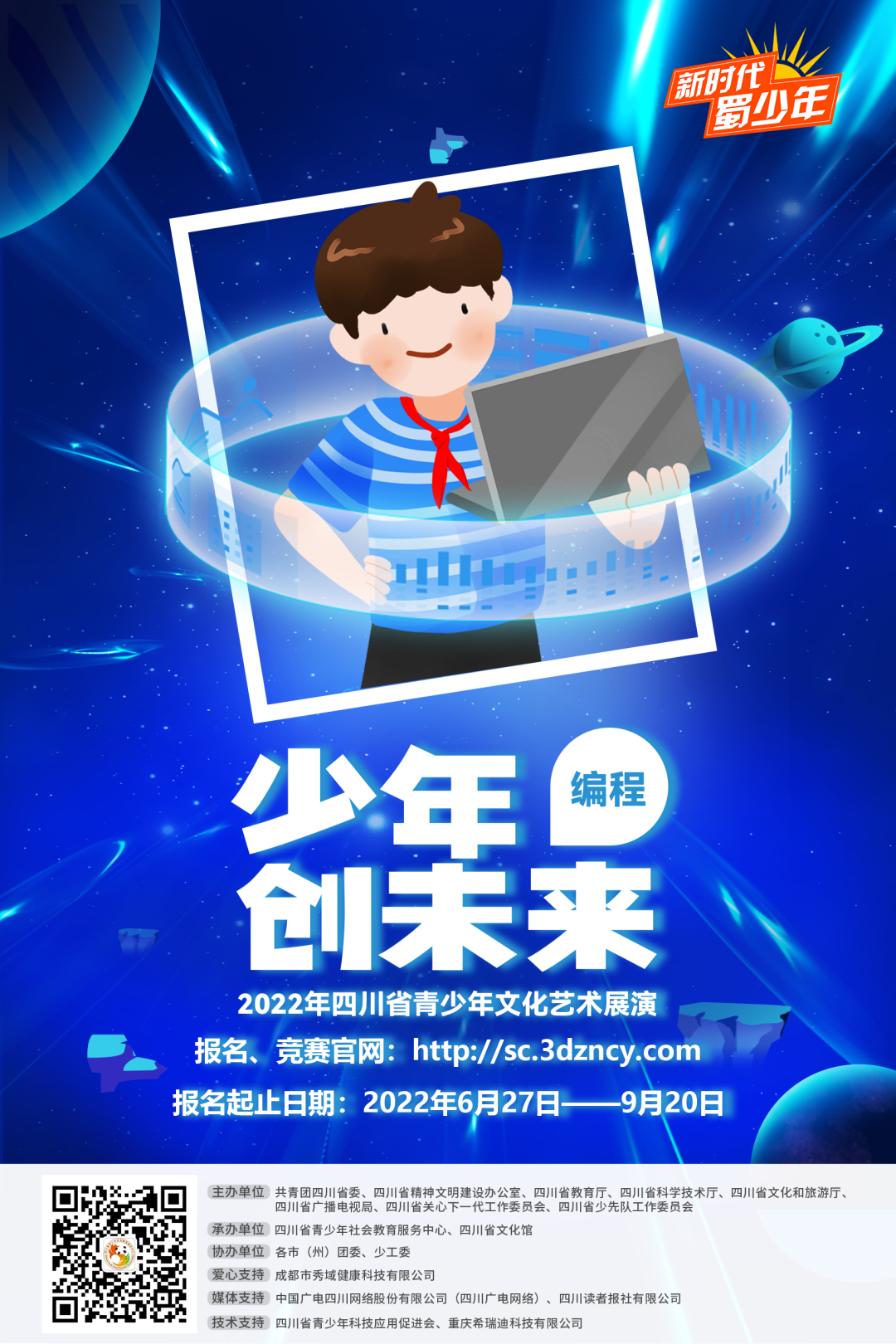 為深入貫徹落實(shí)習(xí)近平新時(shí)代中國特色社會(huì)主義思想和習(xí)近平總書記關(guān)于少年兒童和少先隊(duì)工作的重要論述 今年 主辦單位:共青團(tuán)遂寧市委 承辦單位:遂寧市青少年宮、遂寧市文化館 協(xié)辦單位:各縣(市 2022年的展演活動(dòng)設(shè)置為“舞臺(tái)藝術(shù) 編程(3D創(chuàng)意)項(xiàng)目優(yōu)化升級(jí)為“科學(xué)素質(zhì)測(cè)評(píng)得分+3D智能編程任務(wù)得分+學(xué)業(yè)成績得分”綜合評(píng)價(jià)項(xiàng)目 據(jù)主辦單位相關(guān)負(fù)責(zé)人表示,2022年的展演活動(dòng)報(bào)名通道于7月初全面開啟 據(jù)悉,四川省青少年文化藝術(shù)展演自2018年5月啟動(dòng)以來,主辦單位從最初5家省級(jí)單位增加至8家,活動(dòng)覆蓋四川省五大經(jīng)濟(jì)片區(qū)、21個(gè)市州,參與人數(shù)從2018年的5萬人,逐年遞增至2021年的24.59萬人,累計(jì)參與人數(shù)達(dá)59.59萬人